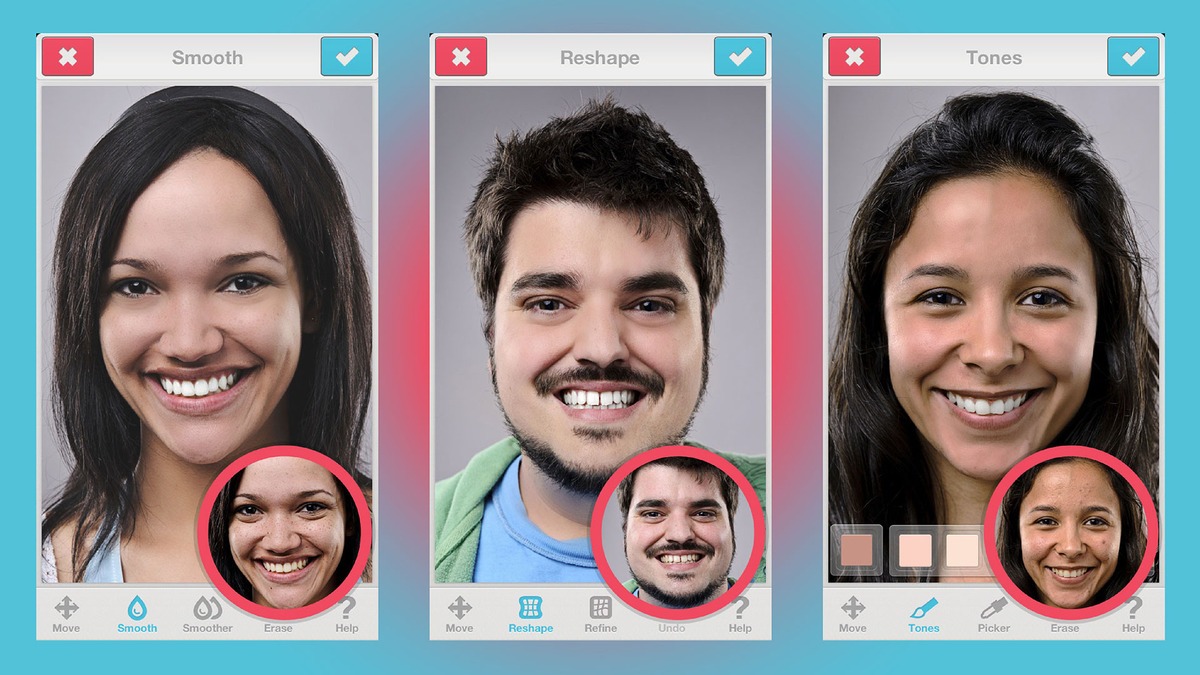 It’s like a cheaper, easier, and mobile version of Photoshop.  Not only does this app literally tune your face in fotos by smoothing and patching things up (using small snapshots of other areas nearby on your skin, to maintain the same pigment), stretching out, or thinning your face, but you can also crop the foto, whiten your teeth, tame red eye, change the tone, defocus your foto, apply filters, and add frames.
