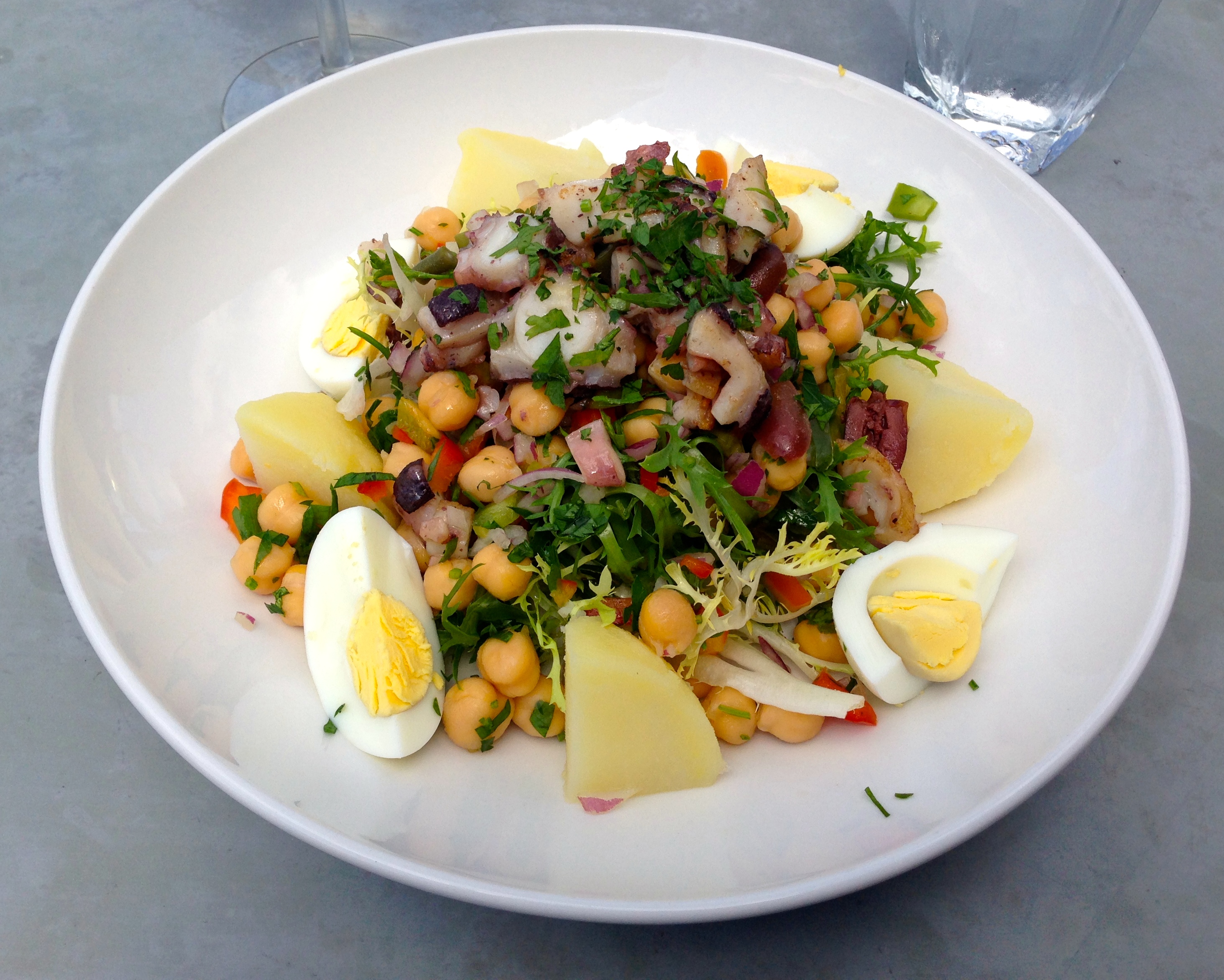 I had ordered the Grilled Octopus Salad (see above) and the Kalamaria (Calamari) and Fennel salad (see below). The Grilled Octopus Salad contained grilled octopus, 1 hard-boiled whole egg (cut into 1/4s), French beans, black olives, poached potatoes, and chickpeas. Honestly, there were too many chickpeas and not enough Octopus, which was unfortunate, since the latter is supposed to be the main part of the dish. However, the Kalamaria and Fennel salad had a more abundant portion of fried calamari, with pepper and fennel, atop a bed of Romaine hearts, roasted red pepper, and a slight, not over-powering lemon dressing. I know the U.S. is known for large portions, but less lettuce would have been better in my opinion (the photo below is deceiving – there is actually much more lettuce under the calamari than it looks). It seemed like a waste when so much was left in the dish. All little things aside, the taste of both dishes was wonderful and light – just what was needed for a hot, sunny day. I would highly recommend trying this restaurant. One of these days I will have to try their dinner menu.