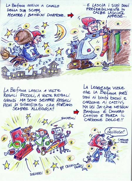 After a long and arduous journey, La Befana continued to search, but could never find either of them. She now flies out on her broom every Epiphany Eve to locate the son of God, leaving gifts of fruit and candy in the stockings/shoes of good children (as Christ may be found in all children) and coal, sticks (only in few regions), garlic, or onions in those of bad children.