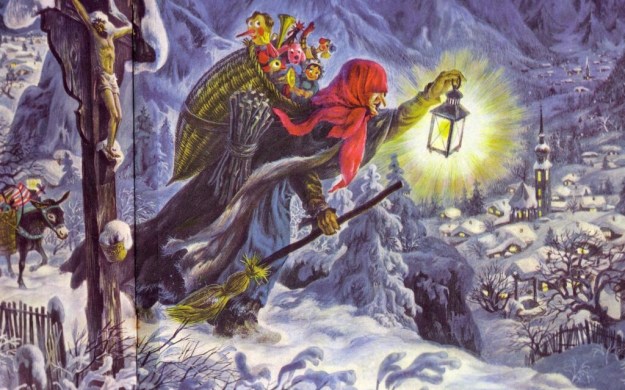 Note: La Befana may also sometimes be depicted as a good witch carrying/riding a broom. This is due to the correlation of her sweeping at her home, being poor, and her method of transportation to the children of the world. However, La Befana is depicted in a much more colourful manner than a witch would; including having a kerchief instead of a pointed hat on her head.